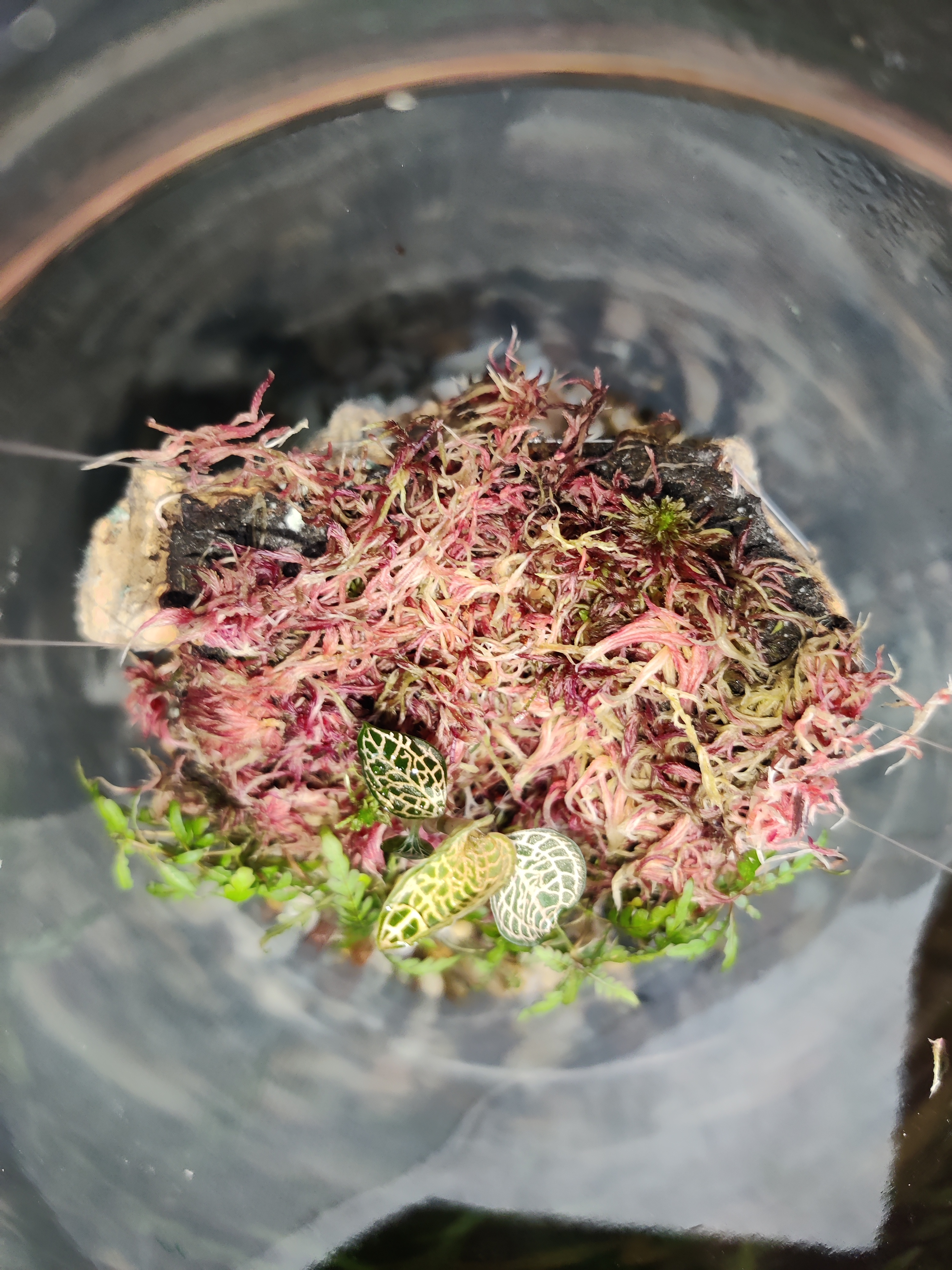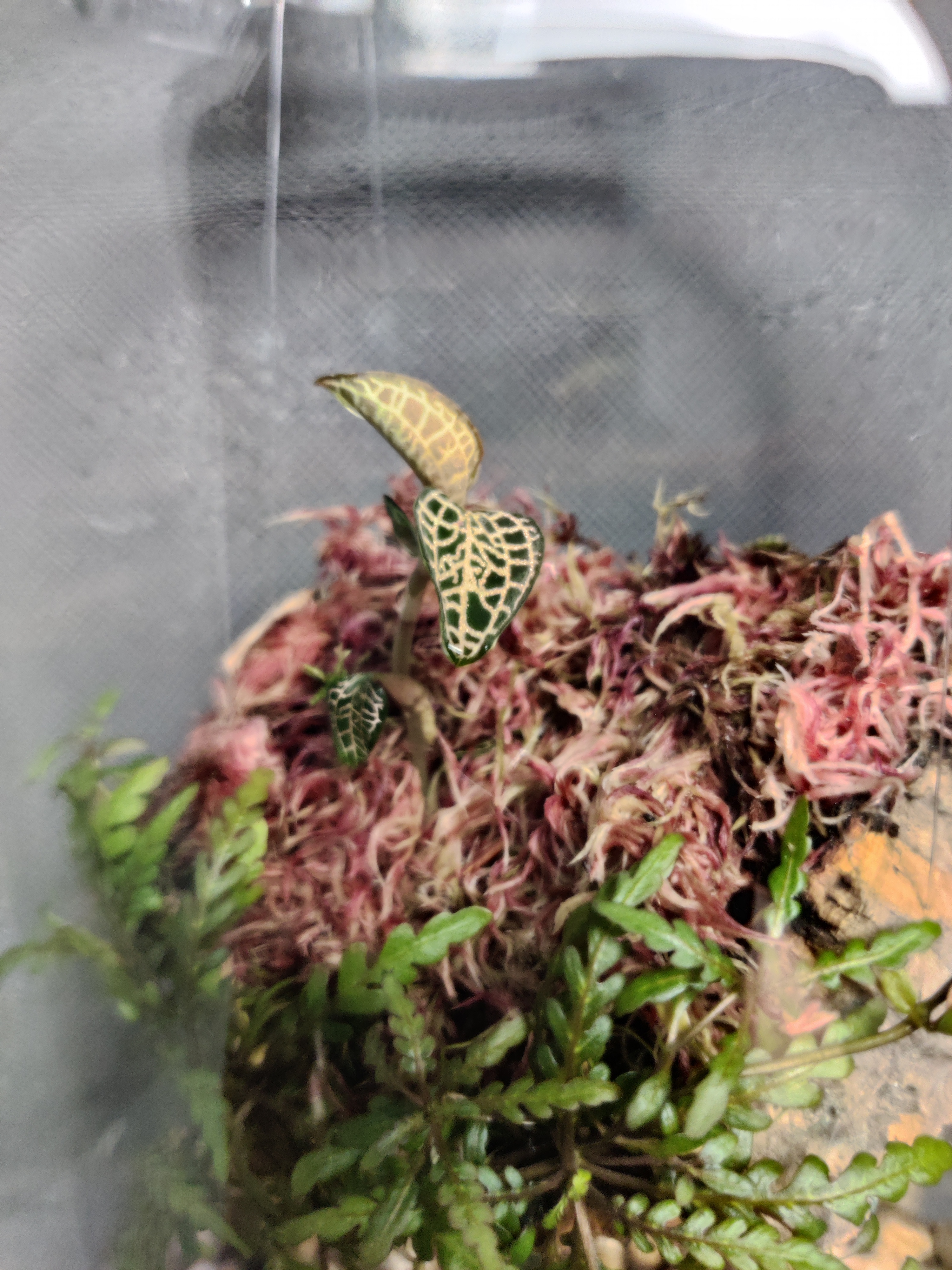 The image shows a glass jar terrarium. Inside the jar, at the base, there is a layer of small, colorful pebbles in shades of white, beige, brown, and grey. Suspended above the pebbles, without visibly touching the bottom, is a round moss ball (Sphagnum Rubella) wrapped in delicate green fern-like plants (Hygrophila pinnatifida). Growing from the top of the moss ball are a few small plants with tiny, patterned leaves, some green with white veins and others slightly reddish (Macodes Anoectochilus roxburghii "Skeleton Hybrid"). The jar is cylindrical with a wide opening at the top, narrowing slightly before flaring out. The overall appearance is clean, minimalist, and carefully arranged, creating a small, floating ecosystem.