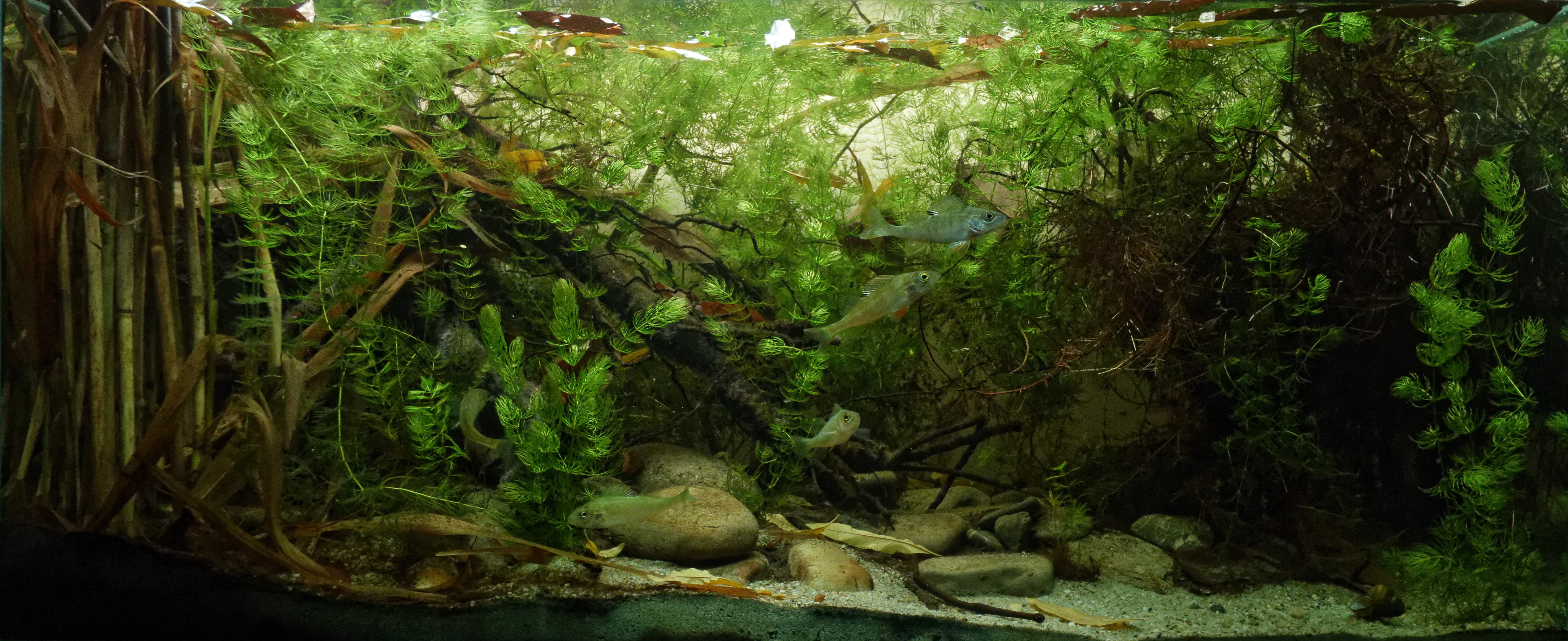 All materials (rocks, roots, leaves, plants and even a bit of mud) are collected from the lake itself. Also the snails (Viviparus Viviparus , Physa marmorata) and the fish (Perca fluviatilis) are caught from the lake. Being a predatory species i chosed to keep only 6 Perca.