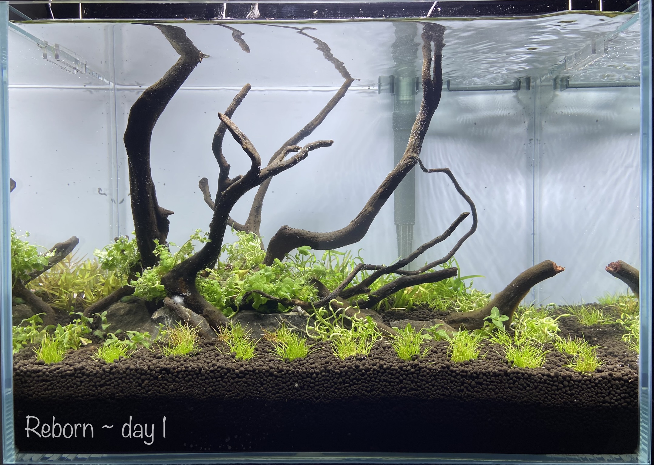 While the execution is proficient, the aquascape lacks a unique, artistic touch that could elevate it to new heights. The wood arrangement, for example, could benefit from added depth.