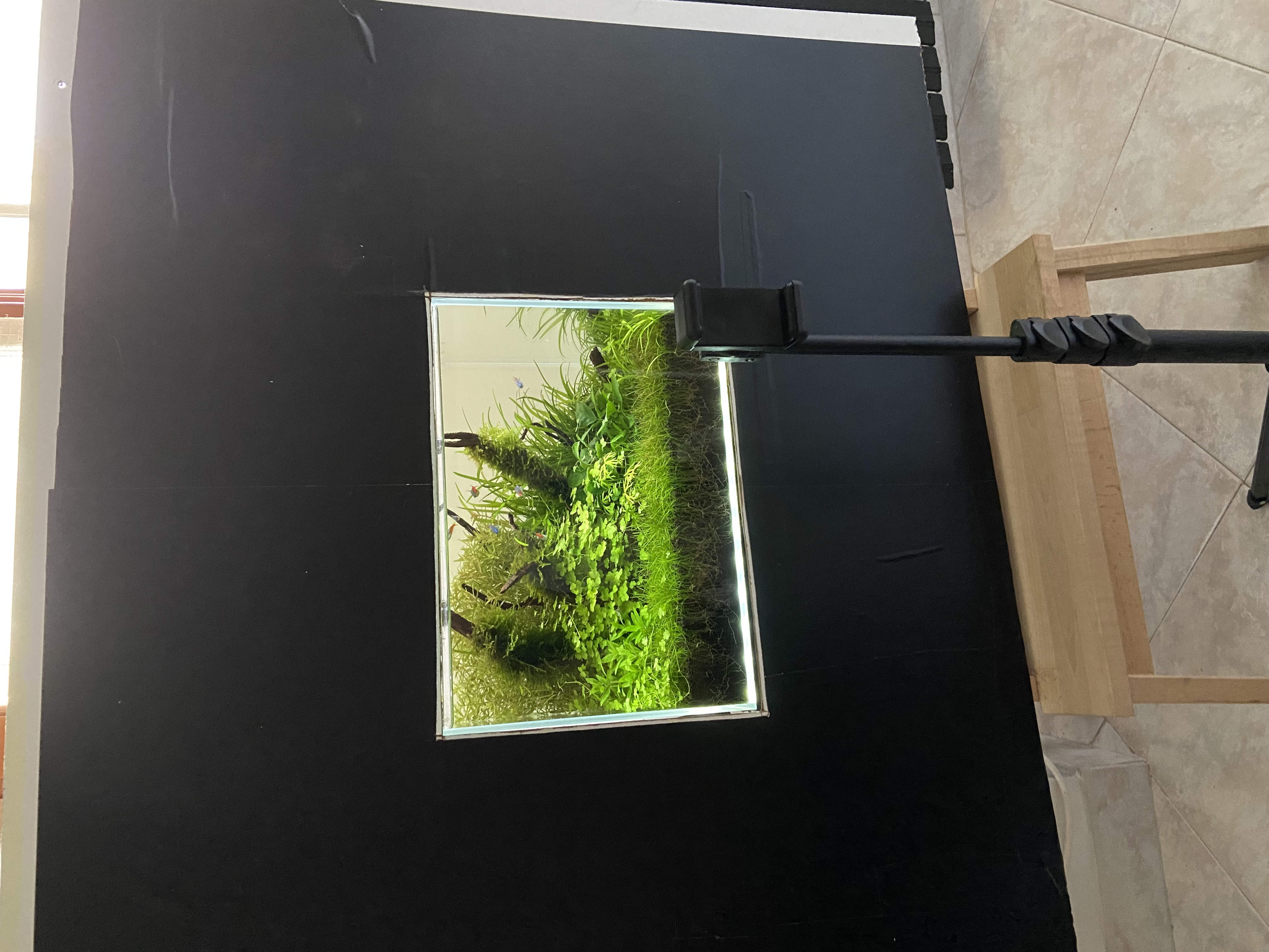 However, the aquascape could gain an additional layer of visual interest with more artistic ingenuity. For instance, repositioning a new thicker piece of wood in the front could add needed depth, creating a more dynamic interplay of highlights and shadows. This would guide the viewer's eyes more effectively through the scene, creating a more immersive experience.