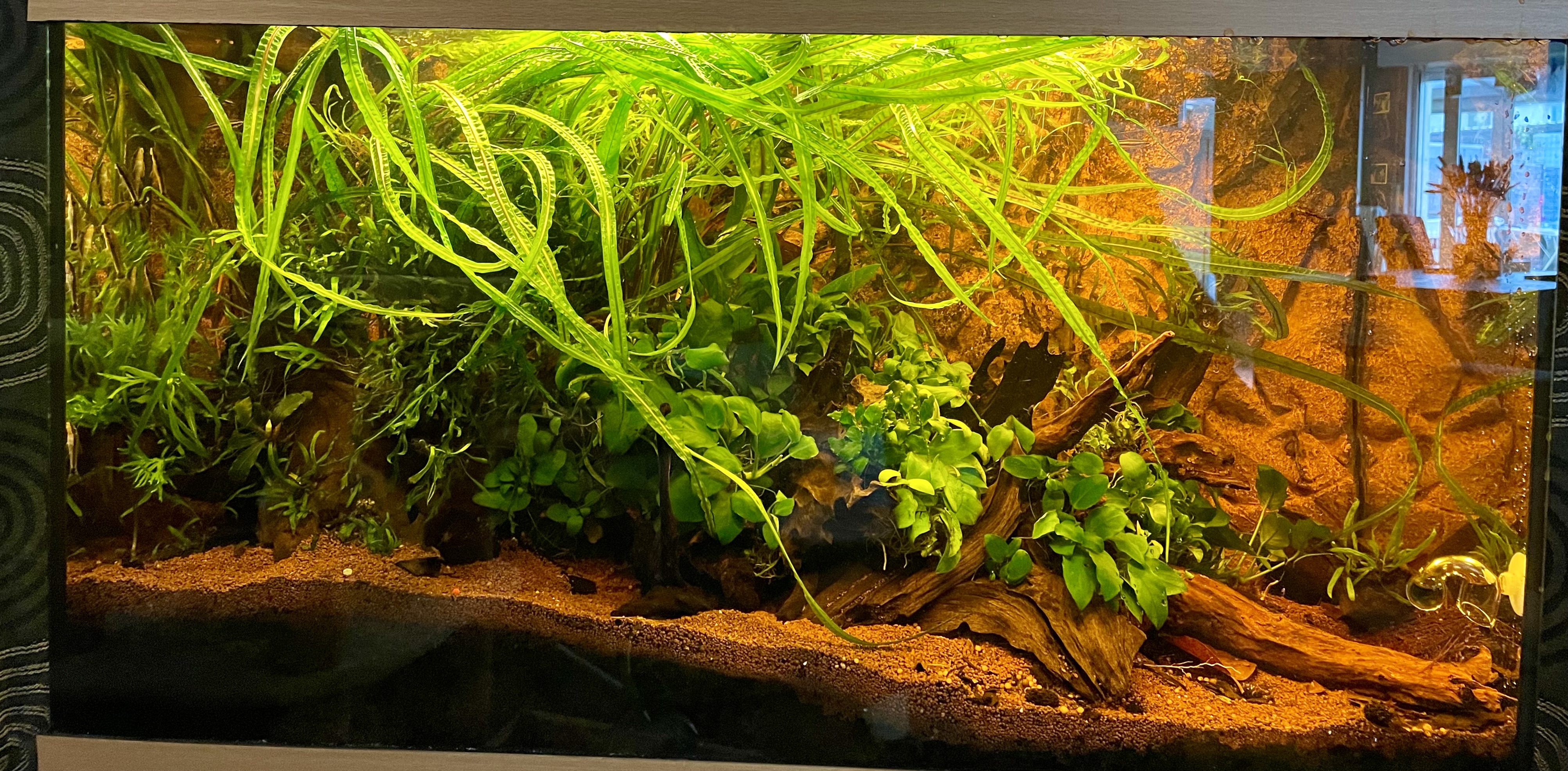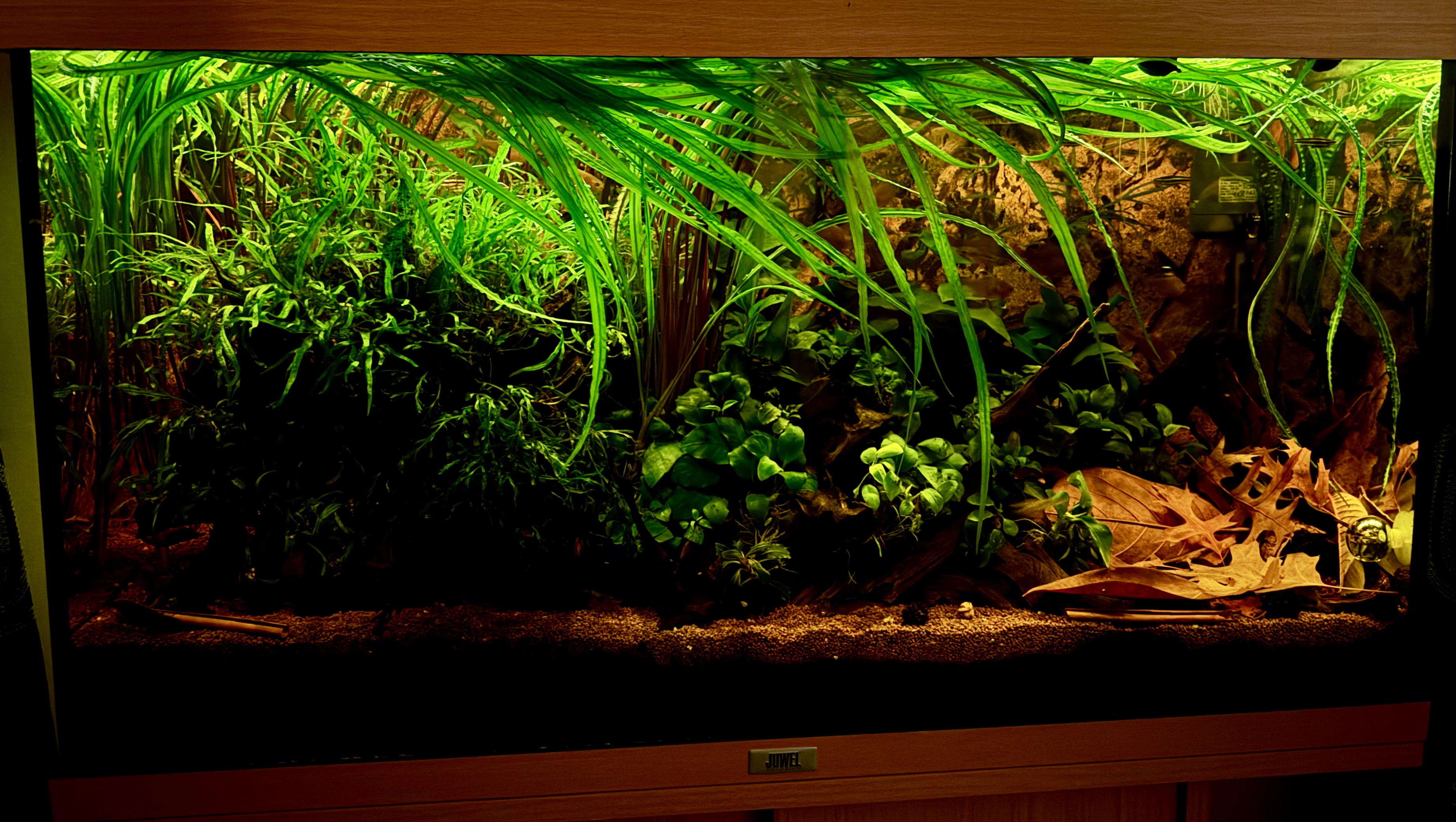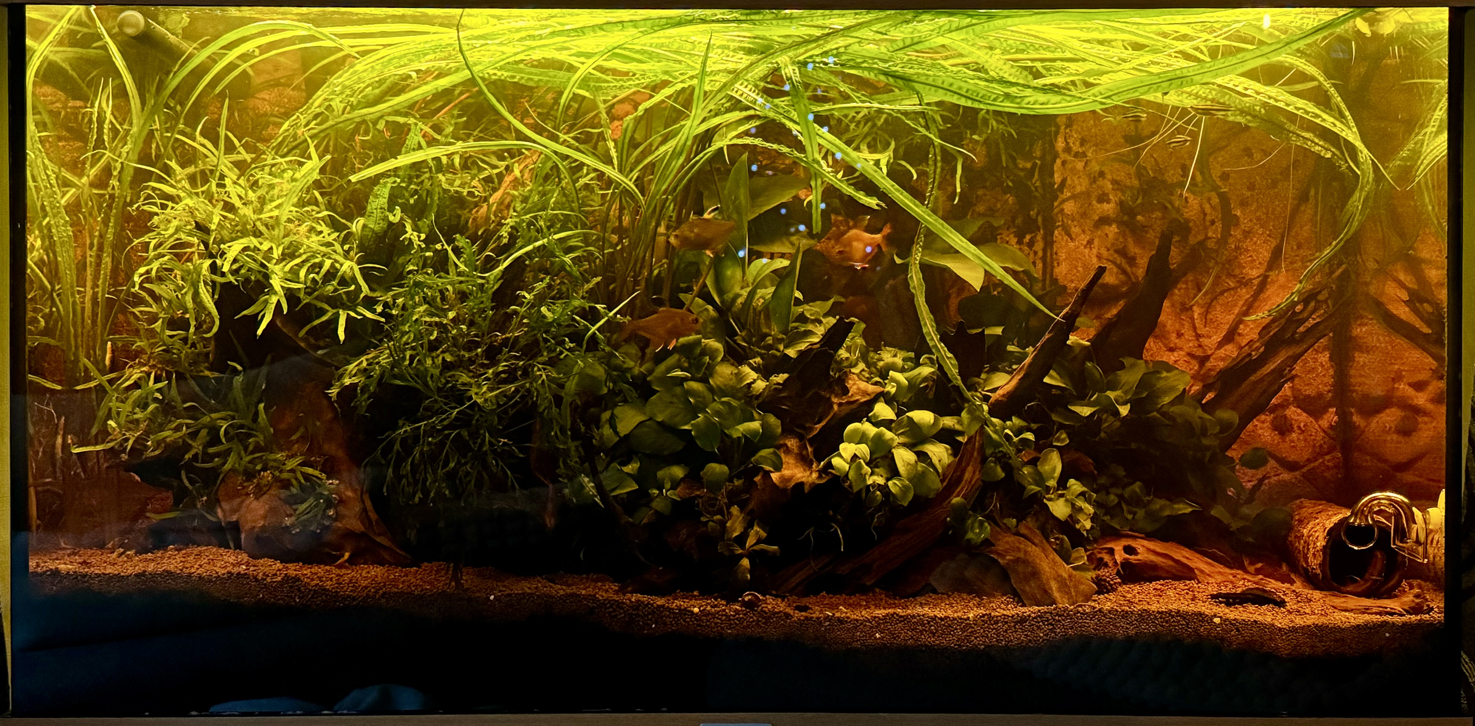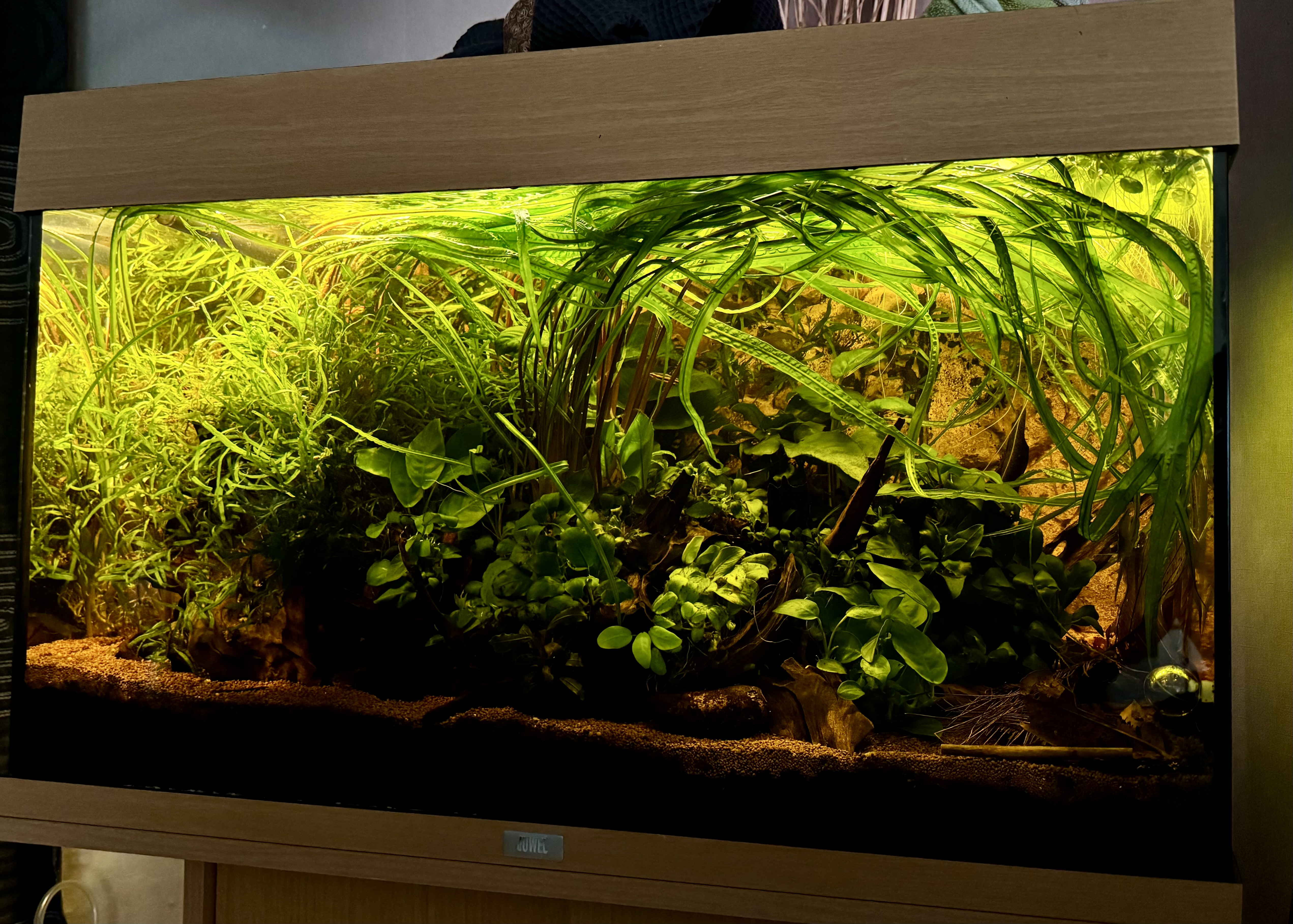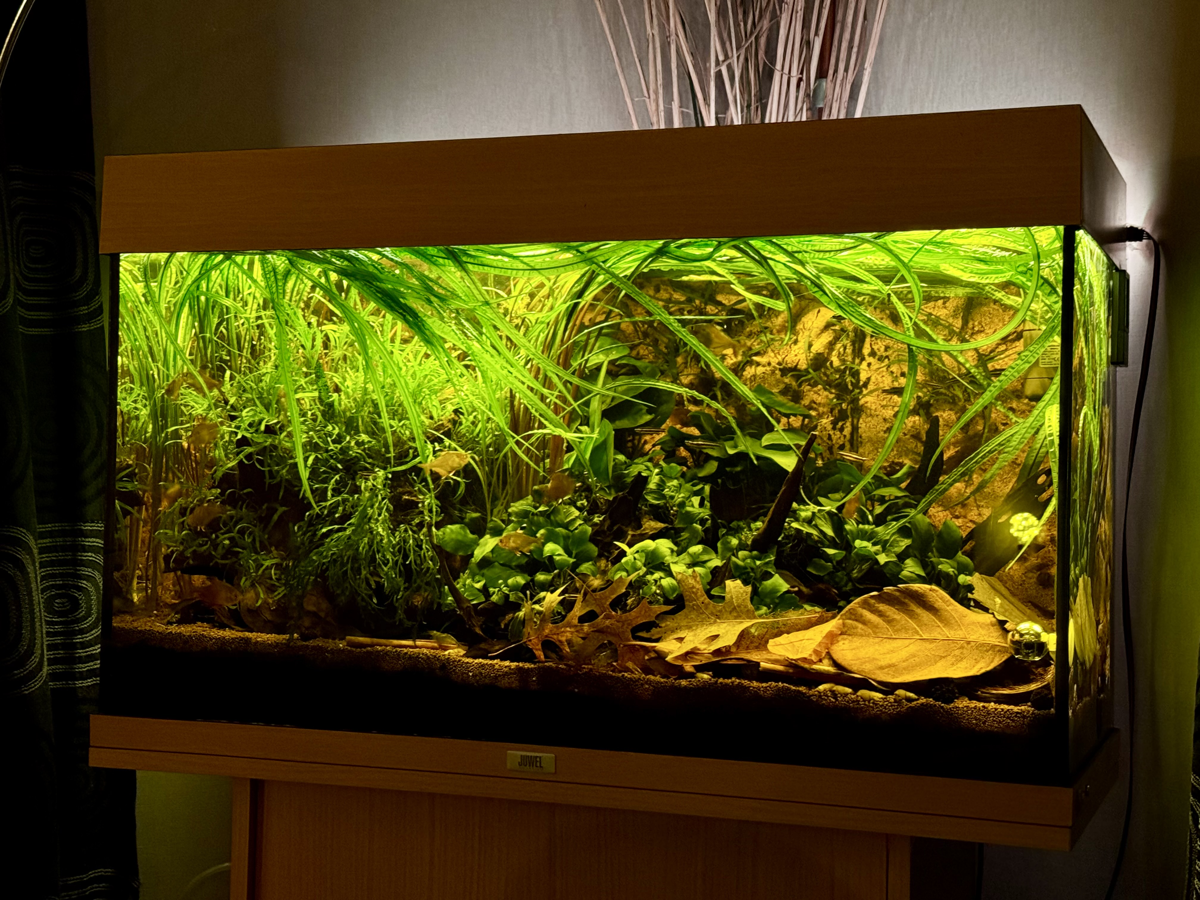 Low energy, rainwater only, tank with lots of botanicals and leaves.