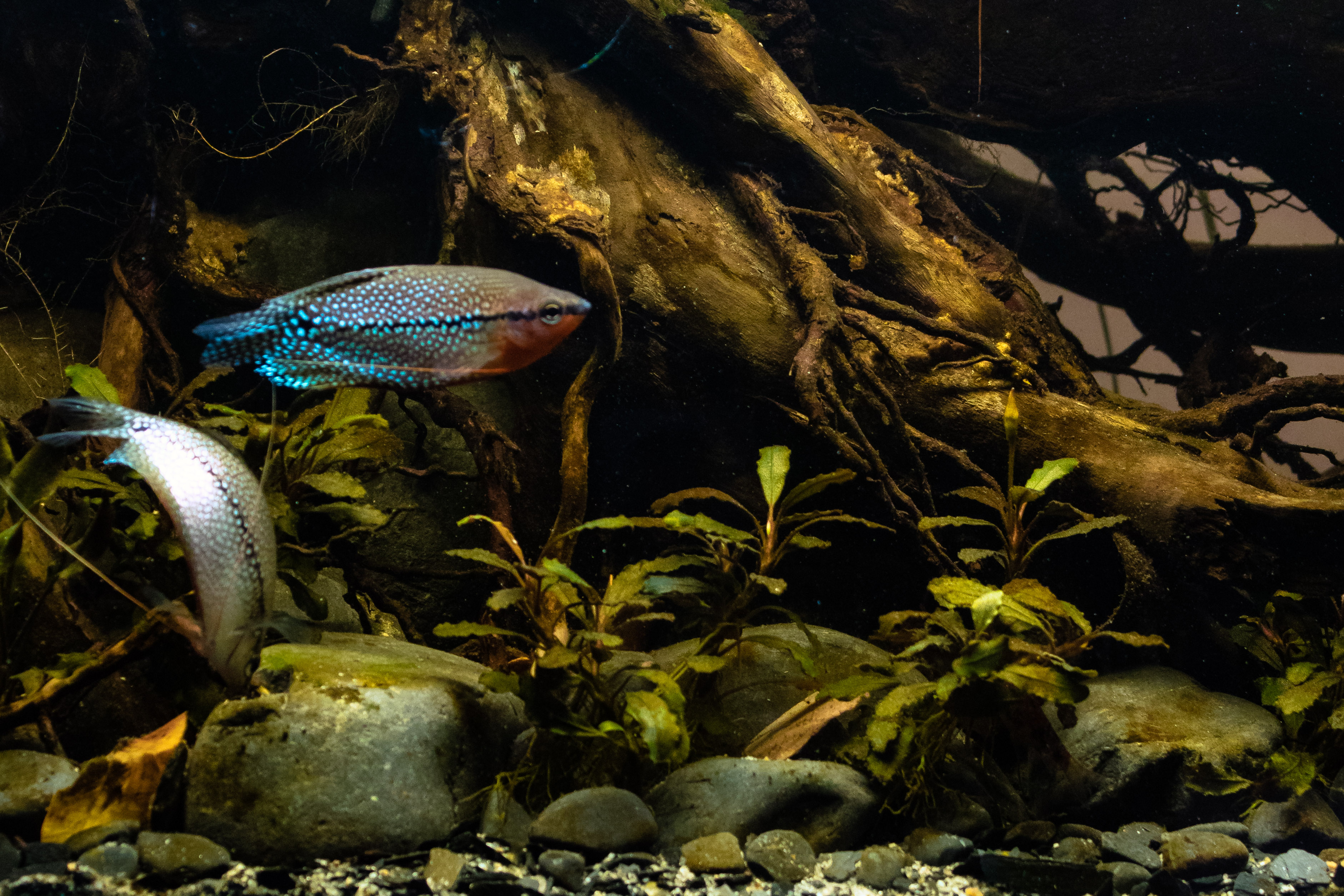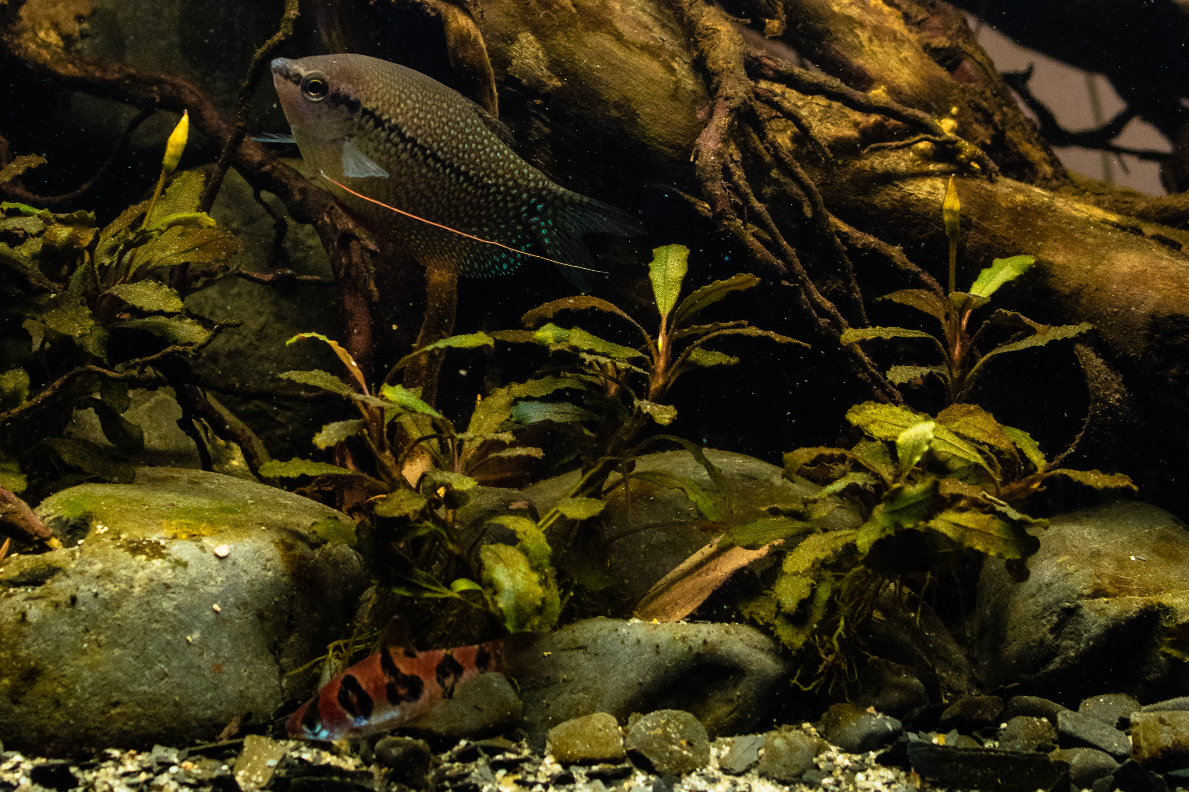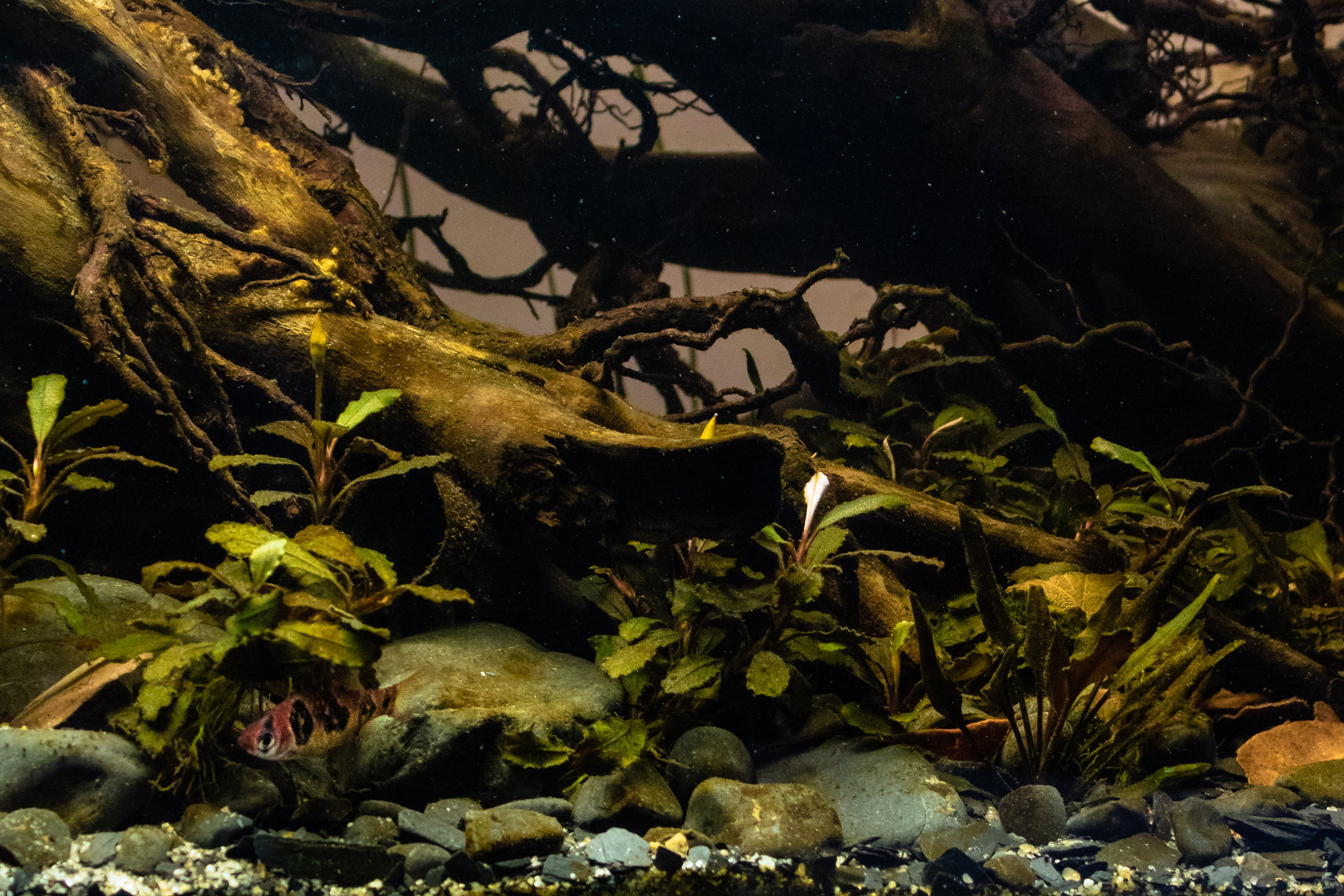 This aquarium represents what we could find in a small forest stream where they flow into Kapuas mainstream (Kalimantan Barat). In the submerged part we can find gravel, sand, with some cobblestones, branches, logs, leaf and some species of bucephalandras and crytocorynes.